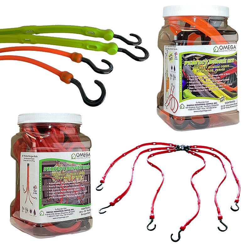 The PERFECT BUNGEE SET contains two 36″ adjustable straps and two 24″ easy stretch cords, providing you with up to seven different lengths in one bungee. The PERFECT BUNGEE WEB is an adjustable 36″ bungee web with 6 straps that easily fits full-size truck beds. Both are UV-resistant and can be used in a variety of temperatures from -40°F to +140°F.